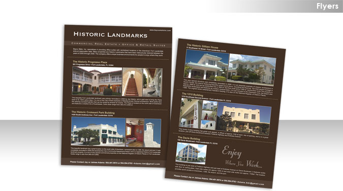 Comments: The client owns five commercial real estate properties in Fort Lauderdale, and needed a nice flyer that would match her website and showcase the properties. Each property has a photo montage and description. |