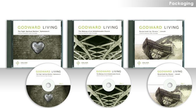 Comments: Each GODWARD LIVING CD package includes a different series of Pastor Tullian Tchividjian's sermons. The packaging was designed to reflect the new branding of Coral Ridge Presbyterian Chruch, and feature strong imagery that ties to the central theme of the sermons. Cover includes Tullian's Bio and a brief synopsis of what the sermon series is about. Packaged CD sets are available for purchase in the the C.R.P.C. Bookstore and sermon audio and other resources are provided free of charge at www.crpc.org.