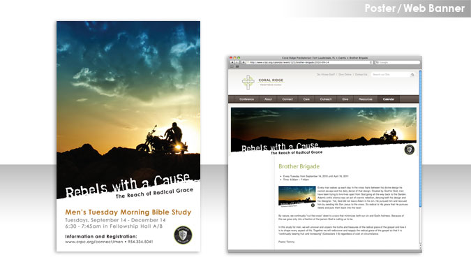 Client: Coral Ridge Presbyterian Church Industry: Church Project Scope: Poster & Web Banner Comments: Client needed a design to promote their men's ministry, "Rebels with a Cause". Posters and web banners were created with a consistent look.