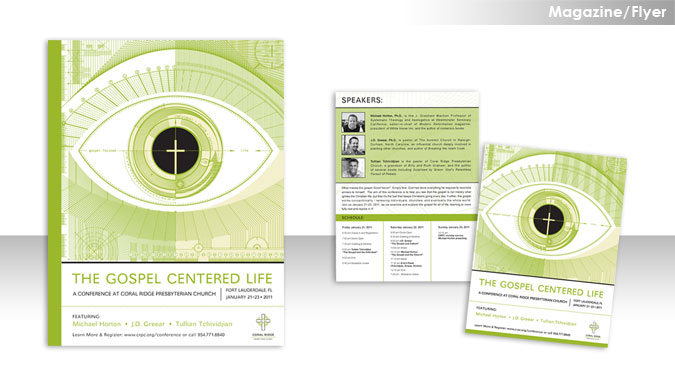 Comments: Client needed a concept for an upcoming conference entitled, "The Gospel Centered Life". The main graphic features an image of an eye in the style of a technical blueprint. The cross in the pupil communicates the central "focus" (pun intended) of the conference. |