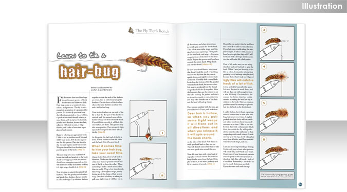 Comments: This was a creative excercise I did a few years back. I love to fly fish and tie flies, so I wrote a step by step instructional article that would teach the viewer how to tie a popular saltwater fly pattern. The accompanying illustrations were drawn by hand and colored in photoshop. I really like the way the illustrations turned out, and its a good example of a clean, engaging magazine spread. |