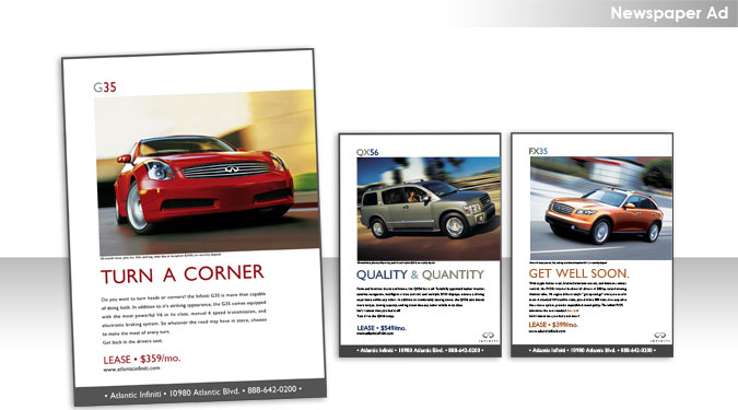 Client: Atlantic Infinity Industry: Auto Project Scope: Newspaper Ad Design, Copy Writing Comments: This newspaper ad campaign uses strong images and cleverly written copy to capture the essence of each vehicle.