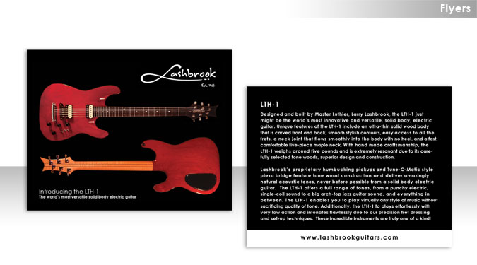 Comments: Flyers were designed to promote the launch of the Lashbrook LTH-1, a line of custom, hand crafted guitars. Flyers were used as a conversation starter at the NAMM tradeshow in Los Angeles. |
