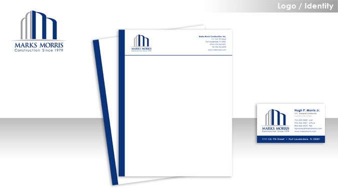 Comments: The client wanted to re-brand the company to reflect a more established professional image. The logo uses two “M”s to create the shape of a building facade which rests on a firm foundation, formed by the Marks Morris name. Blue and grey are colors that instill a feeling of trust and also communicate an established, masculine feel. Font has a traditional feel with a slightly modern element, representing both the history and future of the company. |