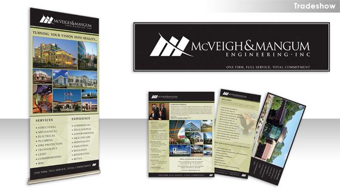 Project Scope: Tradeshow signage uses strong photography to showcase the firm’s strongest projects and list services and experience across various markets. Other materials include a logo banner, a corporate profile, and misc. flyers. |