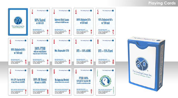 Comments: Client wanted a creative promotional gift to stand out from the rest of the industry... Most other mortgage companies were using standard letter sized sales flyers to let their brokers know what loan products they carried, and according to the sales team, most brokers either had a stack of flyers on their desk a foot high (that they never looked at) or simply treated flyers like junk mail and put them straight in the trash. I suggested that we create a custom deck of useable playing cards that featured different loan program highlights and relevant contact info on each card. This would get the message across and also guarantees a very high retention rate. The promotion was a big success. The sales team was excited about their new promotional tool and it was well recieved by their customers. |